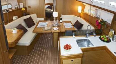 Burners (2x), Carbon mast, Carbon outboard, Cooking tools, Fixed PC with 15 ‘screen, Nautical guides and maps, Navigation software, Safety equipment, Self-inflating vests (8x), Sunshade, Toolbox, Windlass