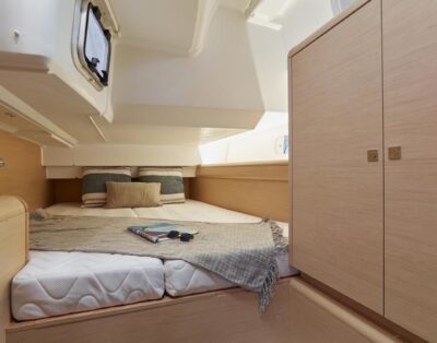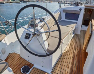 BBQ-Gas operated in the cockpit with sink, Plug 220V/12V, Convertible saloon table, Towels (2 per person), Blankets, Boat documents, Bed Sheets, Pillows & Pillow-cases, Battery charger 25A, Double windlass control with chain counter, Freshwater circuit with shore power, Galley equipment, Electric windlass 1400W remote-controlled, 220V + shore power + outlets in cabins and saloon, Blinds with mosquito net, Electric fans in cabins, Wooden wine cellar, Gas Oven, Rigid boom Vang, Life-line ladder, Stainless steel bathing ladder, Cockpit shower (cold & hot), Automatic shower pump, Mooring ropes, Cockpit seats covered in natural teak, Stainless steel bow protection, Fixed bowsprit, Anchor Type (LEWMAR DELTA 20kg), Outboard engine, Leather-covered steering wheels, Floating light, Jet Thruster, List of lights, Stern-thruster, Bow-thruster, Navigation set, Chart plotter, Divider, Shower, Sun-shades, Galley fully equipped, Outboard type (Mercury), People (4-5), Dinghy type (Plastimo with Hull), Teak cockpit, Repair kit, Toolbox, Box of flares