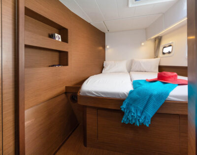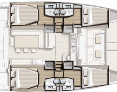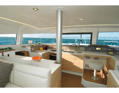 Combine speed, comfort, functionality and luxury with this popular catamaran model. The boat’s steering station is located on the flybridge, a feature that provides safety in navigation due to the perfect visibility while it’s easily accessible from each side of the deck. Apart from the safety and accessibility factor the flybridge can be used as an area for sunbathing. You will find out that the cockpit has enough space to easily move around, and the galley (located at the same level) will be ideal for dinner and breakfast. If you feel like having a glass of wine overlooking the waves, then the second cockpit in the front will be your ideal spot. Book your charter now and live these experiences!