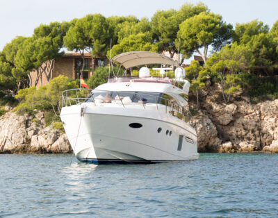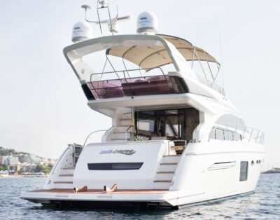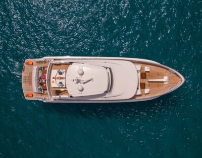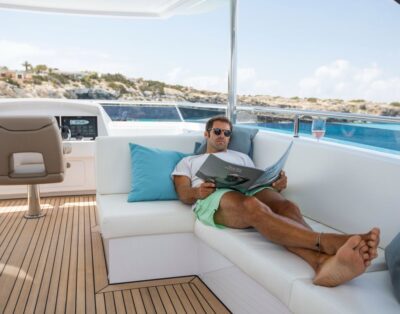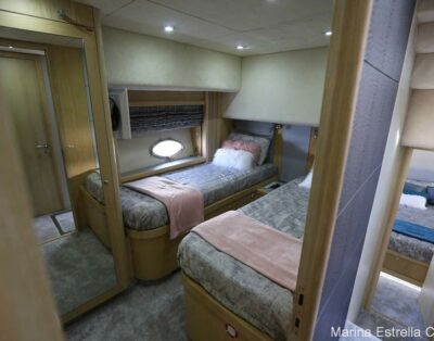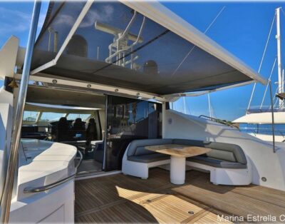 Great bathing platform integrated with cockpit, both with teak floor. Two spacious solariums with cushions in bow and aft cockpit. In the cockpit, she offers a dinning table with BBQ and separated with glass corridor doors, another adittional lounge near the dash, under the hydraulic hard top. Interior decorated in modern style presents a spacefull saloon with complete kitchen and three double cabins all with en-suite. Air conditioning, TV and HIFI, ice machine.. Water toys: Paddle board, snokel gear. Seabob and diving under request