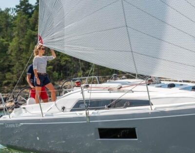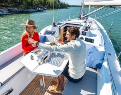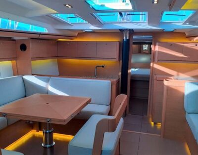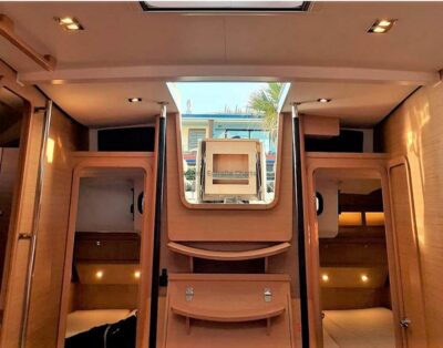 2x12V extra service batteries of 130amp, 3 blades folding propeller, Aft back cushions, Aft bench cushions, Chart table with navigation equipments, Club corner (two armchairs and a mini-bar), Comfortable swim ladder with large handles and teak steps, Complet Safety equipment, Complete anchoring equipment, Davits for dinghy, Electrical 1000W windlass, Electrical winch for mainsail halyard, furler line, mainsail track and Davits, Engine room & locker hatches on gas struts, Fenders + moorings lines, Forward cockpit cushions, Forward cockpit fixed table with trunk and 8 seater flaps, Gas cooker+induction, Gas oven, Helmsman seat cushion, Hot & Cold cockpit shower, Lazybag, Led navigation lights, Pot holder on burner cooking, SUP, Safety equipment for 12 pax with liferaft and EPIRB, Saloon litling bay, Saloon to forward-cockpit opening window, Sliding lateral windows, Snorkel equipment, Snorkeling masks and flippers, Sound system salon/cockpit/Upper deck, Stern spring cleats