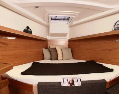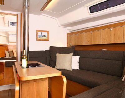 Complete nautical charts of the navigation area, water pilot, triangular protractor, hand bearing compass, automatic pilot, VHF radio, GPS with plotter and e-chart, patent log, echo sounder, wind equipment, EPIRB and life raft, Automatic Identification System (AIS) transponder, FM/AM radio with CD, stove with oven, set of dishes, electric fridge, hot water, cockpit shower, electric anchor winch, bimini top, spray-hood, dinghy with oars, bed linen, cushions, blankets, shower and hand towels, snorkelling equipment for two people.
