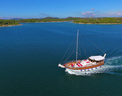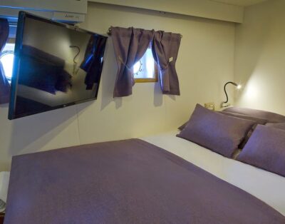 It has a double cabin, a cabin with two double beds (quadruple), and two more double cabins in the bow area.