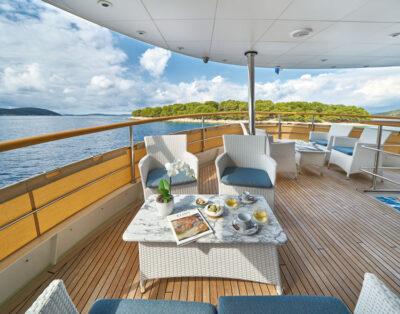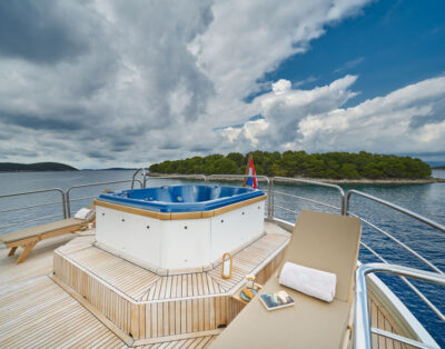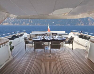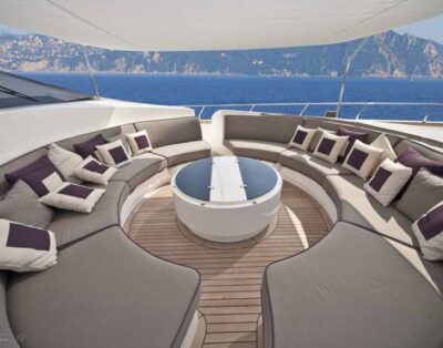 Sea Toys: Tender, Wakeboard, Dougnut, Snorkel gear Predator 72′ main deck offers an impressive helm station with automatic sunroof, behind this is a large seating and dining area with a bar, ideal for relaxing in air-conditioned comfort. Her large stainless steel framed patio doors opening onto her expansive aft deck with a large dining table, upholstered seating and wet bar ideal for al-fresco entertaining. The convertible aft sunbathing area and the large sun pads on the foredeck provide the perfect haven. Inside, her four doble cabins accommodates 8 guests